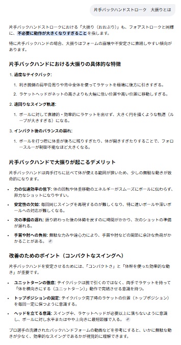 最近はビジネスの世界でもAIを活用しないと時代遅れだなんて言われていますが、テニスの世界でもAIの知見を借りてみようと思い、AIに「片手バックハンドストロークの大振りとは何か」と単刀直入に聞いてみました。
